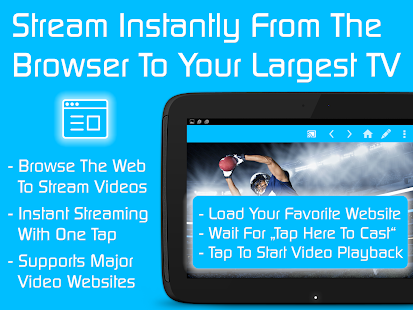 Dengan Video & TV Actors Anda dapat menelusuri melalui situs dan menghapus baris atau video yang Anda inginkan pada Chromecast. Cukup arahkan ke situs web favorit Anda dan mengirim video tertanam dengan sekali tekan untuk Chromecast. Video ditemukan akan ditampilkan di bawah browser. A tap pada link video yang akan mengirimkannya ke Chromecast Anda segera.
